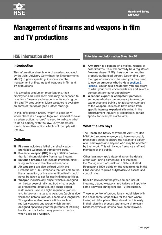 Taught by our team of ex-police and military professionals who were invited by the Health and Safety Executive (HSE) of the UK Government to join a working group to review ‘ETIS 20’. This document determines the guidelines for the Management of firearms and weapons in film and TV productions.